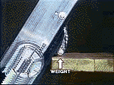 Notice that the Escalera's six inch wheels don't touch the edge of the step. The Escalera lands very gently on the step as it goes down. The lifting cams on the Escalera automatically lift the large six inch wheels up and over the edge. On the way back up the step they also lift the wheels up over the edge and set the wheels down exactly in the same place as they were when it went down the other direction. Notice how the Escalera lifts the load up and over the edge, never actually landing on the edge. Whereas with a normal non-powered handtruck the six-inch wheels would roll all the way to the edge of the step. This is why you never hear of an Escalera breaking the edge of a step off, because it never puts weight on the edge of a step.